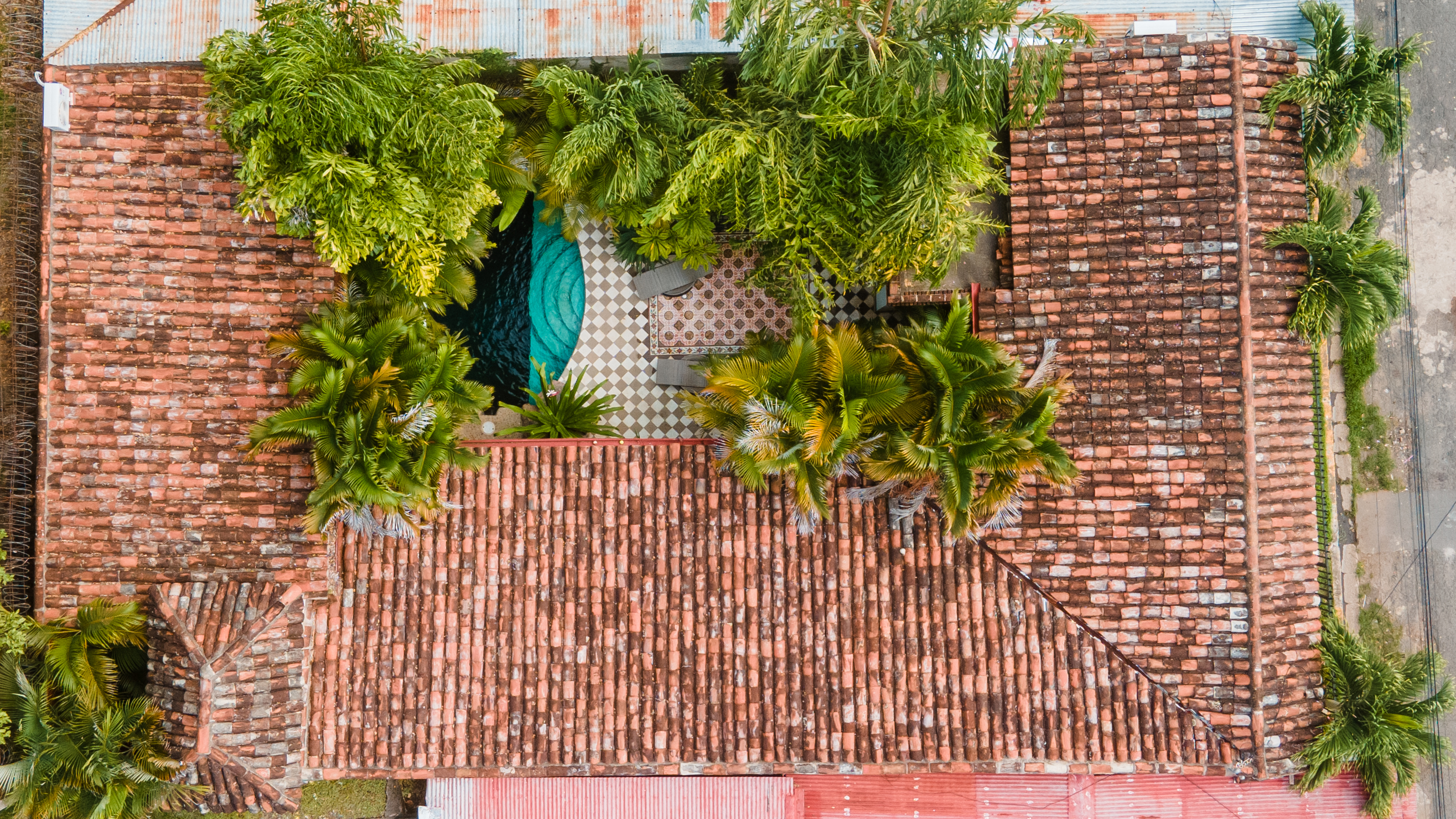 The open central courtyard draws in natural light and a cool breeze, filling the spacious living area with a fresh feel.